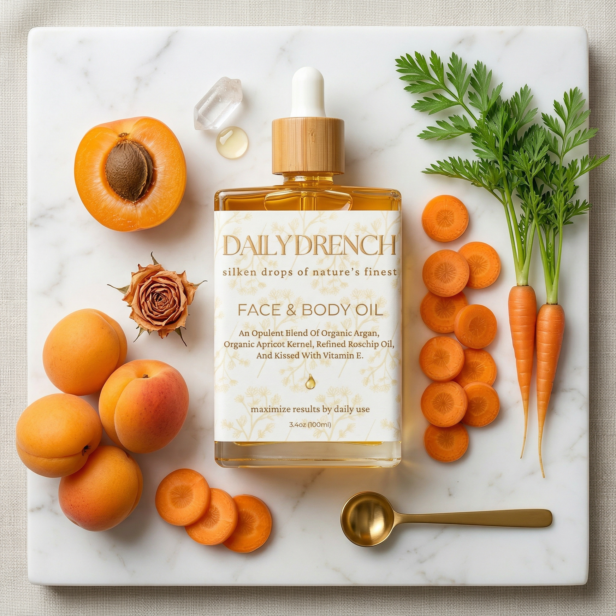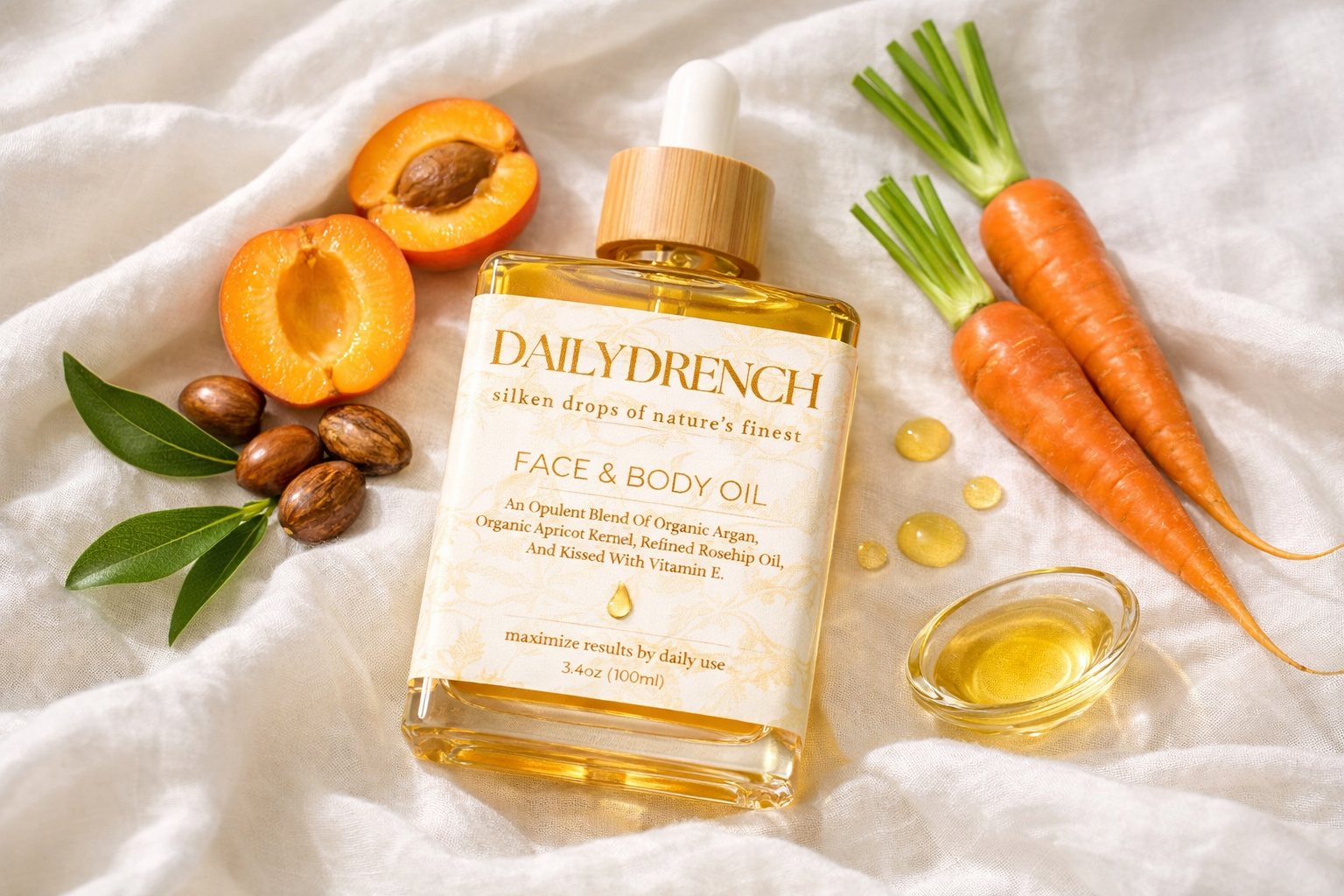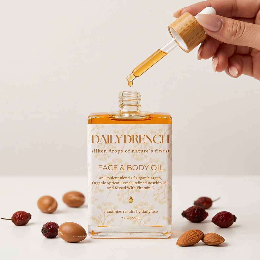 Our Daily Drench Face & Body Oil delivers real nourishment your skin understands, using a balanced blend of organic botanical oils.