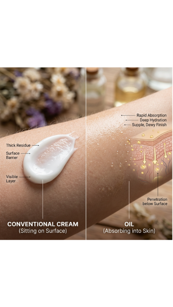 Many products rely on synthetic fragrances, silicones, and petroleum based fillers that create a temporary smooth feeling while leaving the skin carrier stressed and dehydrated underneath.